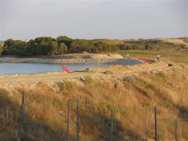 Parte lateral norte, observamos el trabajo de escollera realizado, la estanca a sido vaciada a niveles minimo ecológicos para ejecutar la obra.